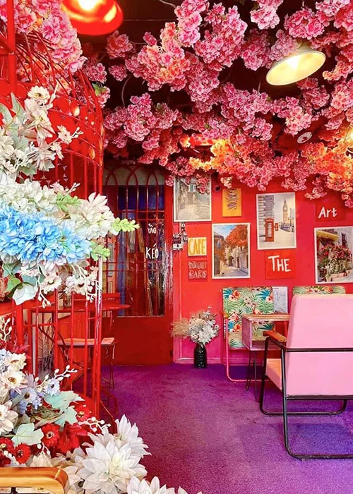 Không gian bên trong có nhiều hoa giả, được đính kết thành từng cụm đẹp mắt. Kết hợp cùng tranh ảnh gợi nhớ về thủ đô nước Pháp, cực kỳ phù hợp với concept nàng thơ, với váy áo bồng bềnh, kẹp nơ xinh xắn. Đừng quên chuẩn bị thêm phụ kiện cần thiết như sách, máy ảnh…