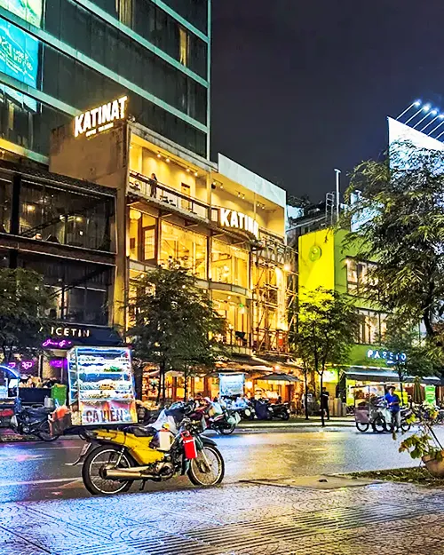 Katinat Ngô Văn Năm có 1 trệt, 3 lầu. Chi nhánh này của Katinat sở hữu không gian được lấy cảm hứng từ kiến trúc truyền thống Nhật Bản với các chi tiết đặc trưng như cửa trượt, tranh ảnh… Ban đêm, quán khá đông khách, đặc biệt là các góc ngồi ngoài trời như vỉa hè và ban công, với chiếc view siêu đỉnh.