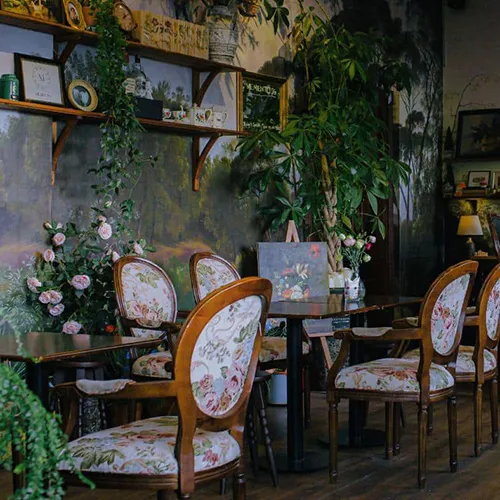 Phía sau cánh cửa được tạo hình như một chiếc tủ sách là không gian mang đậm màu sắc cổ điển của Memento Saigon. Cảm giác như bước vào một cuốn sách tranh, khi mà tất cả các bức tường được bao phủ bởi những mảng màu của thiên nhiên.