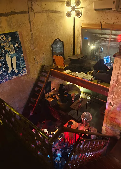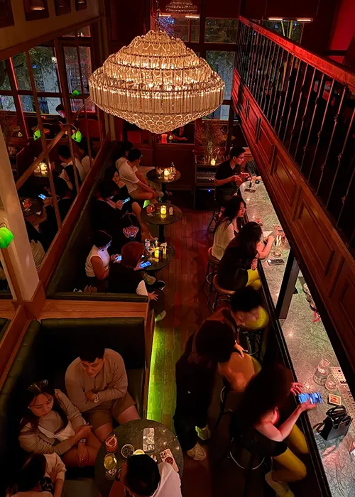 Về đêm, không gian của Hoàng Thị mang một vẻ đẹp ma mị, đặc biệt là khu vực quầy bar. Dưới ánh sáng đèn, mỗi chi tiết đều trở nên sống động, có phần kỳ quái nhưng lôi cuốn và quyến rũ.