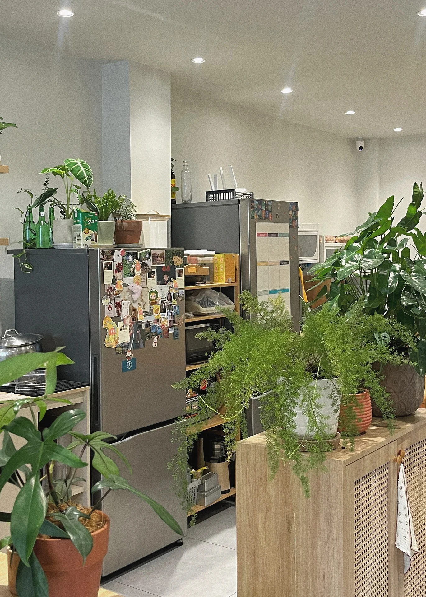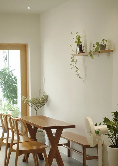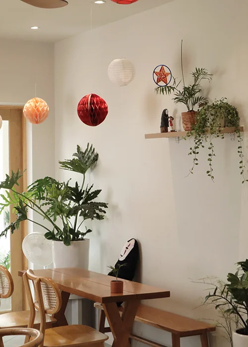 Quán nhỏ nhưng ấm cúng. Sự kết hợp của tường trắng với nội thất gỗ mang đến cảm giác nhẹ nhàng. Mỗi góc đều có màu xanh, đa dạng về kích thước và kiểu dáng.
